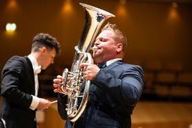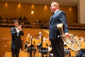 In der Tat, dieses Gefühl spiegelte sich in der Art der Interpretation der gleichermaßen anspruchsvollen wie auf besondere Art unterhaltsamen musikalischen Beiträge. Dabei standen im ersten Programmteil neben den beiden Wettbewerbsbeiträgen der Bläserphilharmonie beim "Flicorno d'Oro" in Riva del Garda der phänomenale Solovortrag von Alexander Wurz im Mittelpunkt. Wo selbst für geübte Ohren die Grenze der Virtuosität erreicht sein dürfte, da setzt der Solist auf dem Tenorhorn aus Baden-Württemberg lässig noch eins drauf. In diesem Fall bei der Komposition mit dem Titel 'Pantomime' aus der Feder von Philip Sparke. Unfassbar, was Alexander Wurz aus diesem Instrument, dass sonst eher der böhmisch-mährischen Blasmusik zugerechnet wird, dem begeisterten Bamberger Publikum vorzauberte!