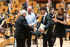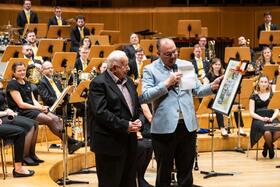 Nach derlei Aufregung führte das Wiegenlied 'The Seal Lullaby' vom selben Komponisten dann hin zu einem weiteren besonderen Moment des Abends: Vorstandschef Bernd Froese bat zwei Persönlichkeiten nach vorne, die beide sehr viel von Musik verstehen und die beide die Entwicklung des Vereins und seiner Orchester in den letzten Jahrzehnten maßgeblich prägten: Im Jahr 1972, als das zarte Pflänzchen 'Knabenkapelle Buckenhofen' zu verkümmern drohte, fand man in dem Landwirt und Musiker aus Gunzendorf, Willi Saffer, einen echten Kenner seines Faches. Er, der im nächsten Frühjahr seinen 90. Geburtstag feiern kann, führte die Jugendblaskappelle von da an fast dreißig Jahre lang von Erfolg zu Erfolg. 50 Jahre später durfte sich "der Willi" für dieses Jubiläum mit stehendem Applaus feiern lassen.