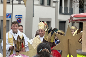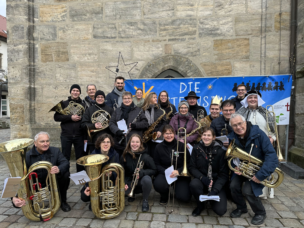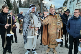 Unter der Leitung von Christian Libera kamen 20 Musiker:innen zusammen, um die Prozession am frühen Nachmittag zur Diözesanen Eröffnung der Aktion Dreikönigssingen musikalisch zu gestalten. Unter dem Motto "Gemeinsam für unsere Erde - in Amazonien und weltweit". Zwei Könige, unsere Posaunisten Leon Händel und Philipp Molitor, mischten sich unter uns.