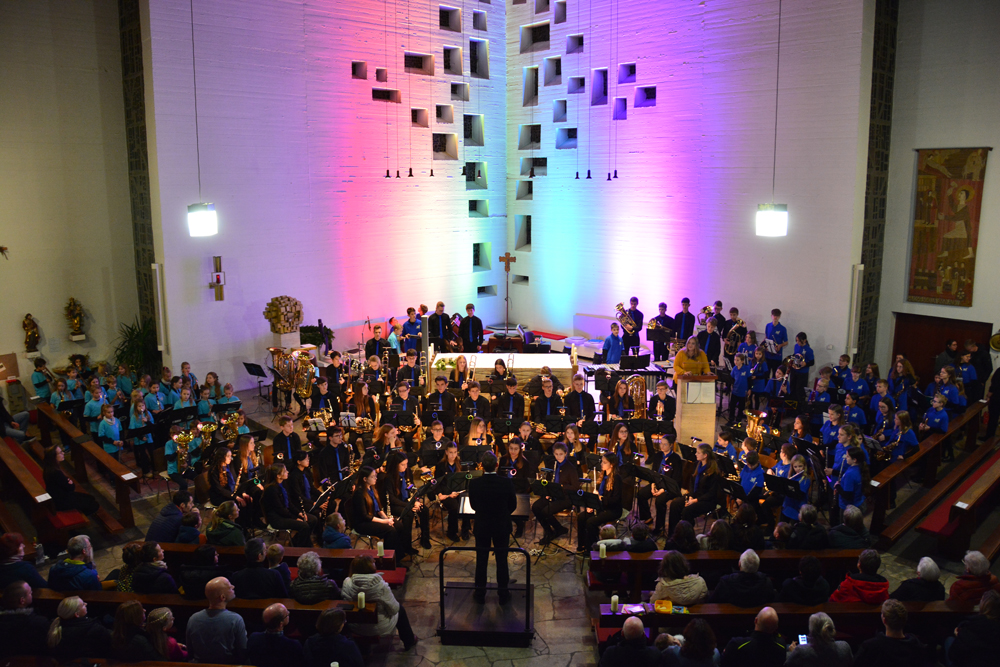 Am Sonntag betraten die Ausbildungsorchester des MVFB nach dem morgendlichen Adventsgottesdienst den Altarraum der Buckenhofener Pfarrkirche St. Josef. Ab 15:00 Uhr strömten die Zuhörer, und im Nu waren alle 350 Sitzplätze besetzt. Zum Beginn des Konzerts war das gesamte Kirchenschiff zusammen mit etwa 120 aktiven Musikern voll. Moderiert von Anna-Lena Schwab eröffnete die Bläserklasse 2024/26, deren Mitglieder erst seit 10 Wochen als Orchester zusammen spielen. "So herrlich süß schräg", beschrieb eine Kollegin aus dem Jugendblasorchester den Auftritt. Dennoch waren Klassiker wie "Morgen kommt der Weihnachtsmann" (Komponist W. A. Mozart) und weitere Stücke klar erkennbar, die für die Eltern und Großeltern himmlisch klangen. Gemeinsam mit den ein Jahr älteren Musikern der Bläserklasse 2022/24 ernteten sie unter der Leitung von Lisa Lochner begeisterten Applaus.