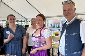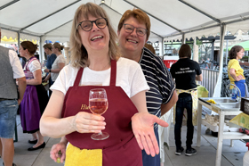 Eine Hundertschaft des Musikvereins hatte alle Hände voll zu tun, die großen Mengen an Erfrischungsgetränken zusammen mit den erlesenen Weinen vom Weingut Michael Fröhlich aus Escherndorf an der Mainschleife auszuschänken und an das Feiervolk zu bringen. Im Küchenzelt wurde unermüdlich frisches Bauernbrot belegt, und die Zwiebelkuchen-Backöfen liefen im Dauerbetrieb.