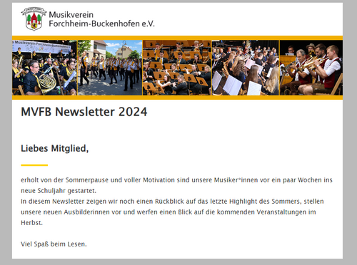 Sie wollen bequem per Email über Konzerte, Auftritte & Veranstaltungen, die Ausbildungsmöglichkeiten oder wichtige Neuigkeiten im Musikverein Forchheim-Buckenhofen (MVFB) informiert werden? Dann melden Sie sich für unseren (DSGVO-konformen) MVFB-Newsletter an!